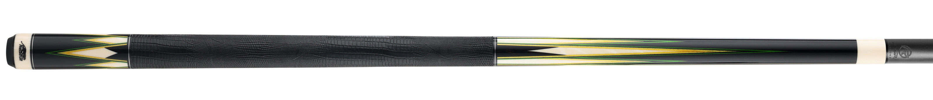 - Ebenholz-Butt-Sleeve mit acht gespleißten Spitzen, versehen mit Furnieren in Grün, Schwarz, Hellgrün und Gelb sowie Details aus Ebenholz und Ivorine