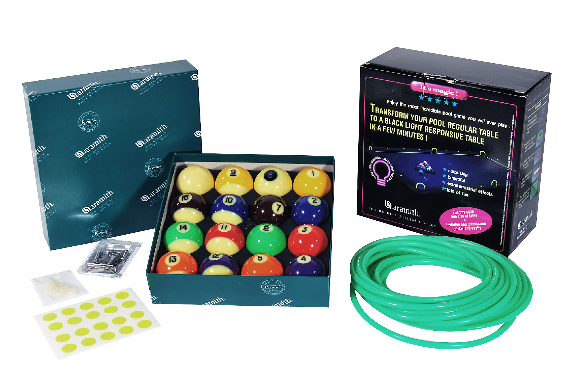 • Set: Kugeln plus fluoreszierendes Zubehör für Tischmarkierung und Queue-Orientierung