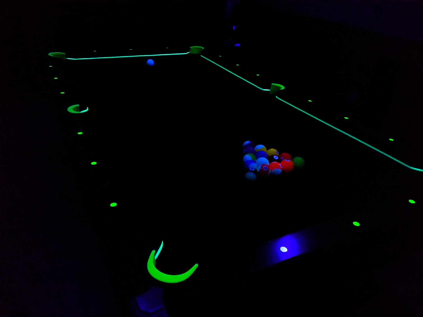 Aramith "Glow in the Dark" Billardkugeln Set leuchtet unter Schwarzlicht.