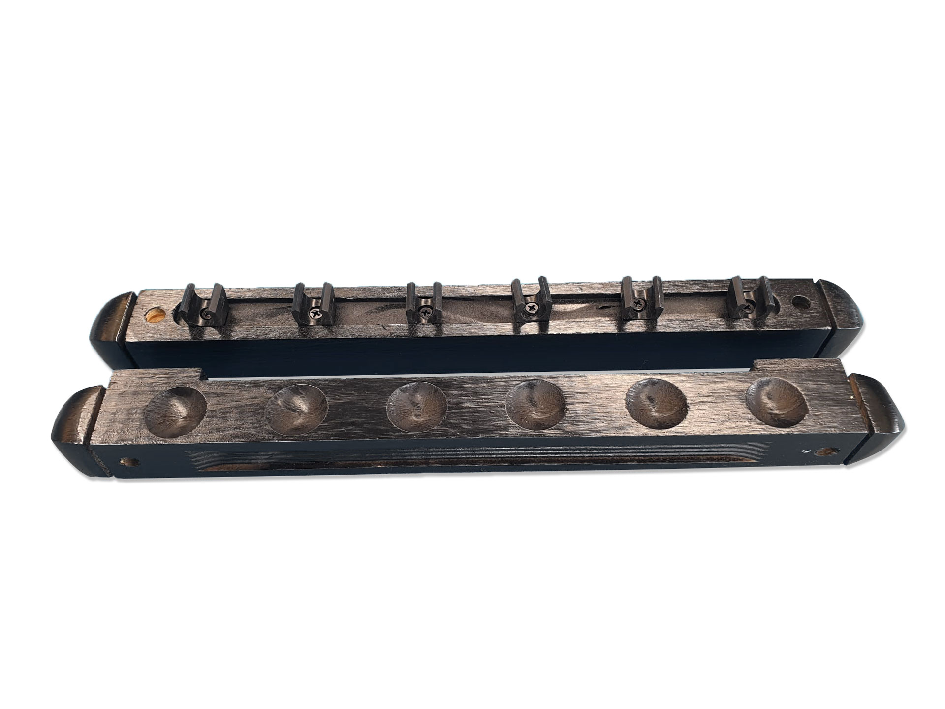 Queuehalter "Antik" aus Massivholz ist in der Farbe Schwarz gebeizt. Durch seine schmale Form fügt er sich in jeden Raum perfekt ein. Er bietet Platz für 6 Queues bzw. Queuebrücken. Die Kunststoff-clipse sind weich und vorne abgerundet, damit Ihre Queues nicht beschädigt werden. Die Länge beträgt 40 cm.