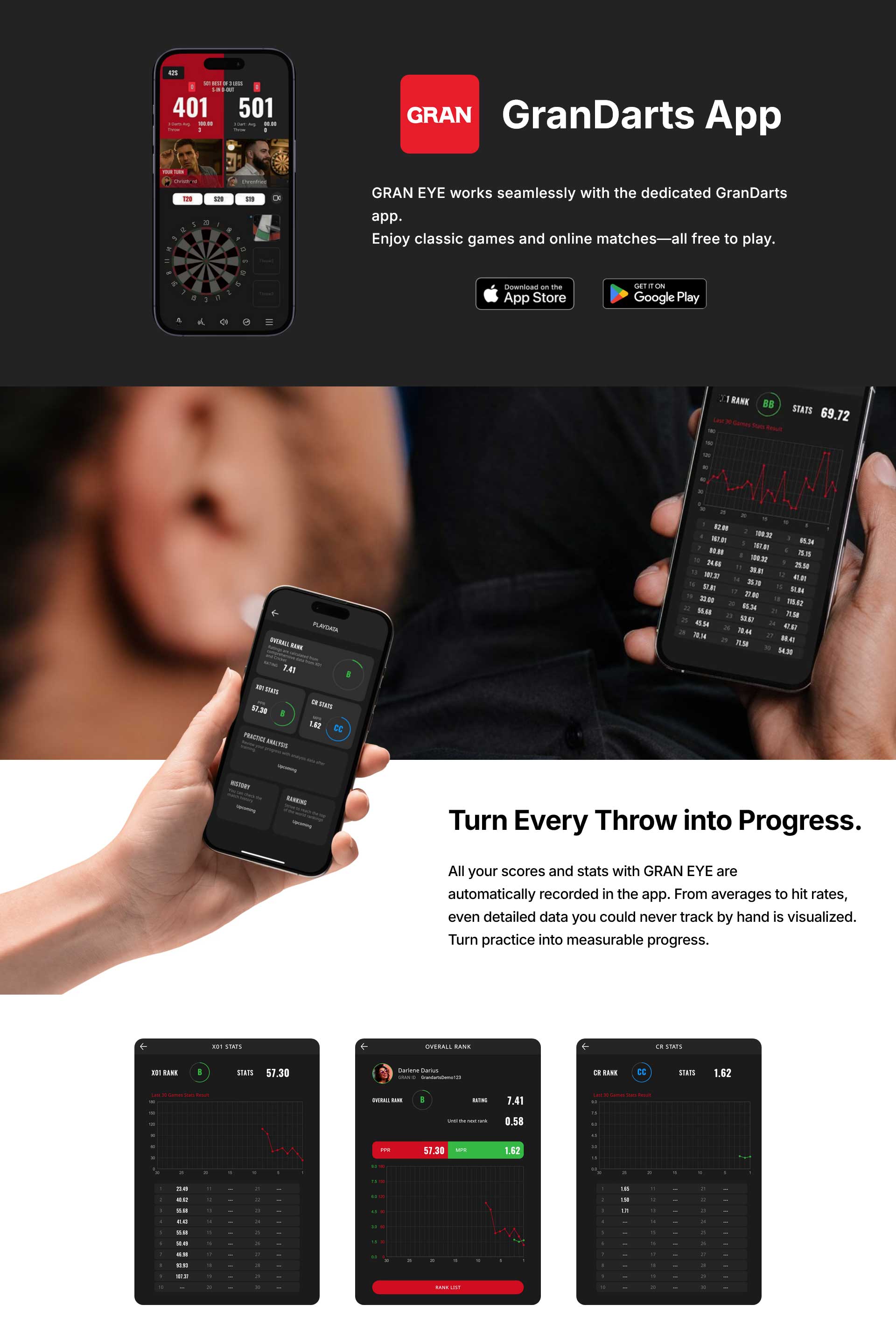 GRAN EYE’s AI keeps learning and evolving all the time. This improves not only accuracy and recognition speed – it can also drive smarter refinements to the overall dart experience. The result: consistently best-possible performance every time you play.